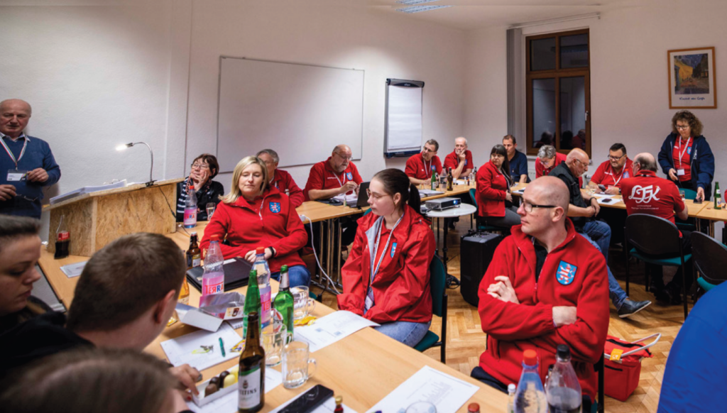 Während einer kleinen Kaffeepause bereitete Michael Kremer die anschließende Fotoaktion vor, denn Fotos der jeweiligen Ausschüsse und des Präsidiums mussten geschossen werden. Anschließend ging es zurück in die Jugendherberge, wo die einzelnen Ausschüsse tagten und das Verbandsheft mit der Aktualisierung der Ausschussrichtlinien fütterten. Auf Wunsch vieler Teilnehmenden wurde der Abendprogrammpunkt „Marienglashöhle“ storniert, sodass die gewonnene Zeit für weitere Zusammenarbeit genutzt werden konnte. Dies bewies noch einmal, wie sehr alle Beteiligten daran interessiert waren, ihre Arbeit gemeinsam zu vollenden.